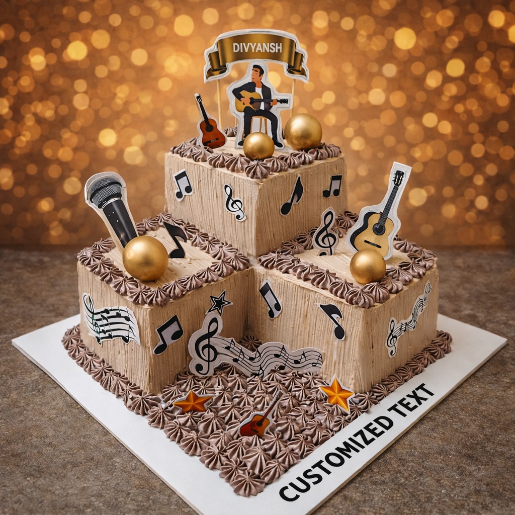 Rich chocolate cake with musical guitar dรฉcor and personalized name topper โ€” perfect for music loversโ€™ celebrations. ๐ŸŽถ๐Ÿซ